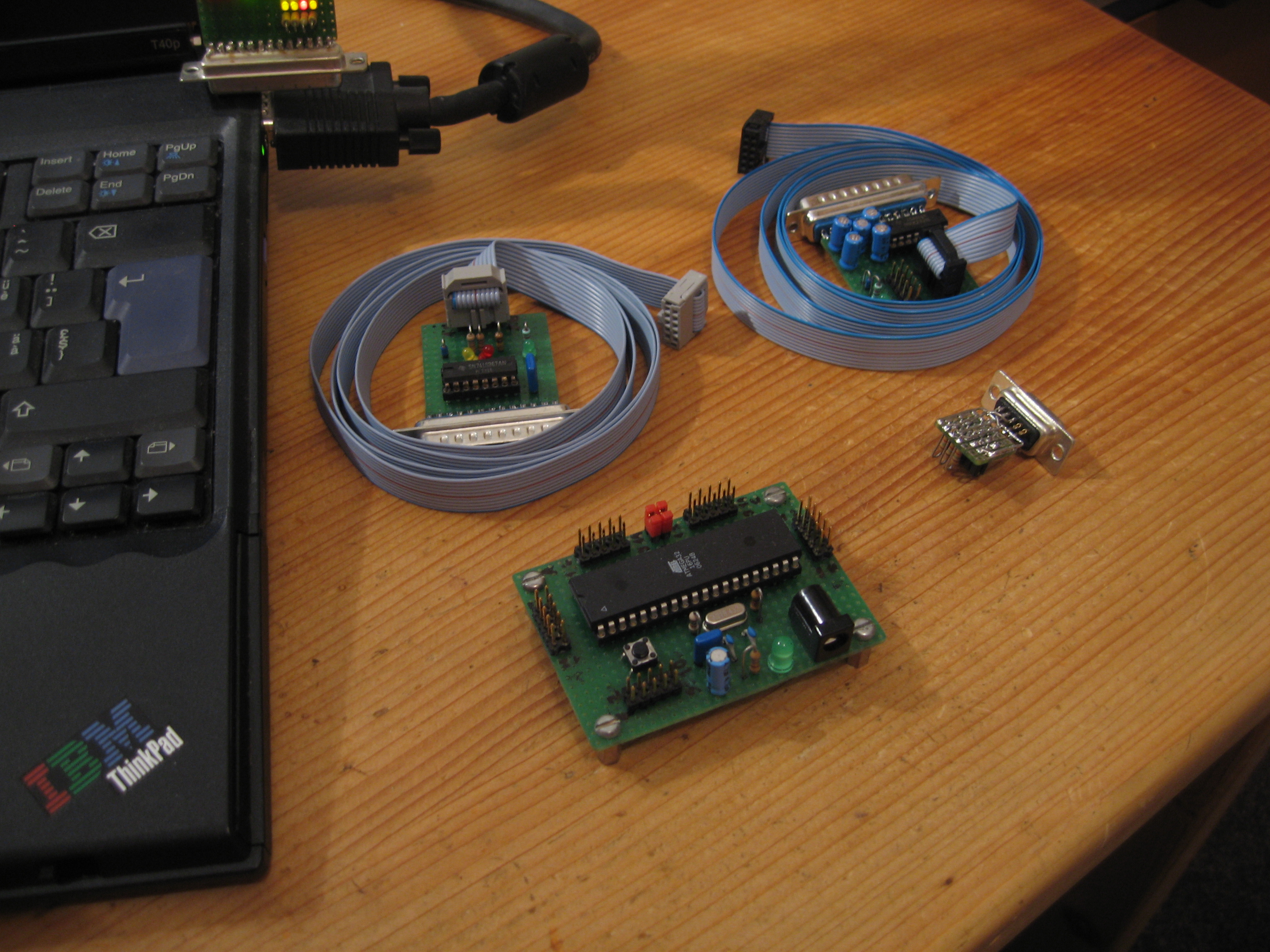 Logisch braucht es dann noch einen STK200 kompatiblen PC LPT Parallelport AVR Programmieradapter (ist ebenfalls in obiger Verdrahtung mit beschrieben), plus 10pin Bandkabel an die Experimentierplatine, und ein DB25 Kabel für an den LPT Port. Dabei entstand auch gleich ein UART zu RS232 Adapter mit einem MAX232, welches zwischen Programmieradapter und Experimentierplatine eingeschleift wird, plus 10pin Bandkabel an Experimentierplatine, und ein DB25 Kabel für an den COM Port. Ein RS232 LED Tester und sein LPT Parallelport Gegenstück sind dabei auch nützlich. Ein RS232 Nullmodem sowie Adapter von COM Port 9pin an RS232 25pin waren bereits vorhanden.